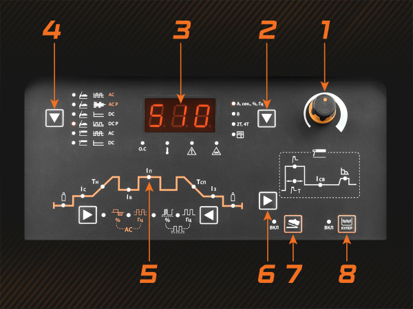 - Выбор параметров сварки: ток, баланс полярности, 2Т и 4Т режимы сварки, режимы сварочной горелки, память программ сварки