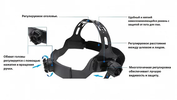 Особое внимание уделено защите от вредных излучений. В пластик имеет добавки делающий его практически непроницаемым для ультрафиолета. Корпус маски изготавливается из специального особо чистого нейлона, который при нагреве практически не выделяет вредных паров. Маска испытана по самым строгим требованиям и может работать в тяжелых условиях сварочного производства.