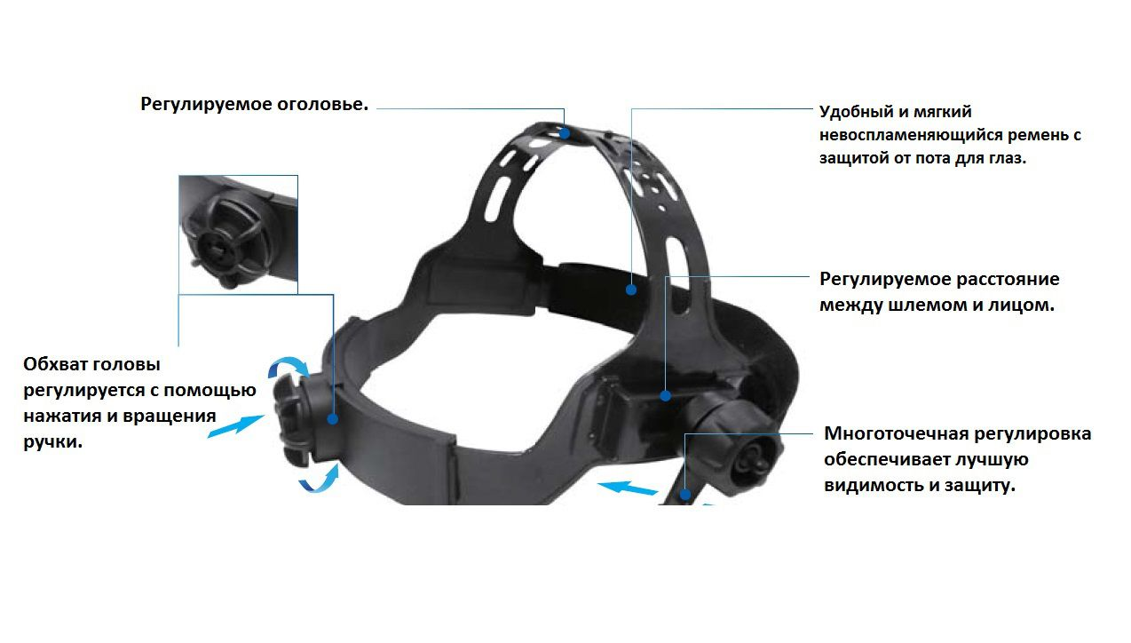 Степень затемнения изменяется в пределах 9-13 DIN. Ручка регулятора степени затемнения находится снаружи корпуса маски с левой стороны. Ручка изготовлена так, чтобы еще можно было вращать в сварочной рукавице.