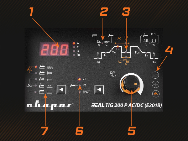 Аппарат REAL TIG 200 P AC/DC имеет классическую систему управления: