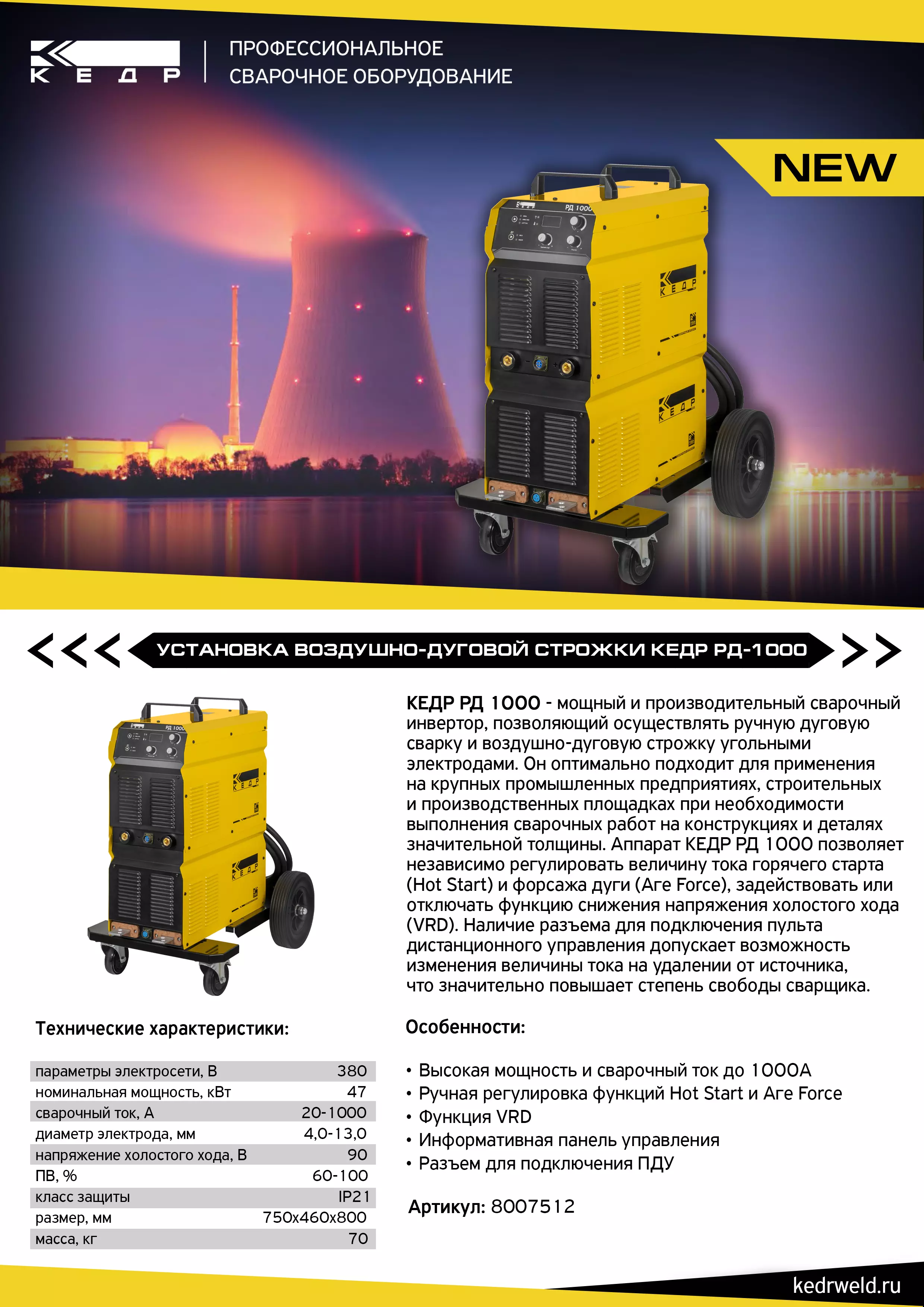 - Высокое значение ПВ: КЕДР РД 1000: 1000А при 60% ПВ