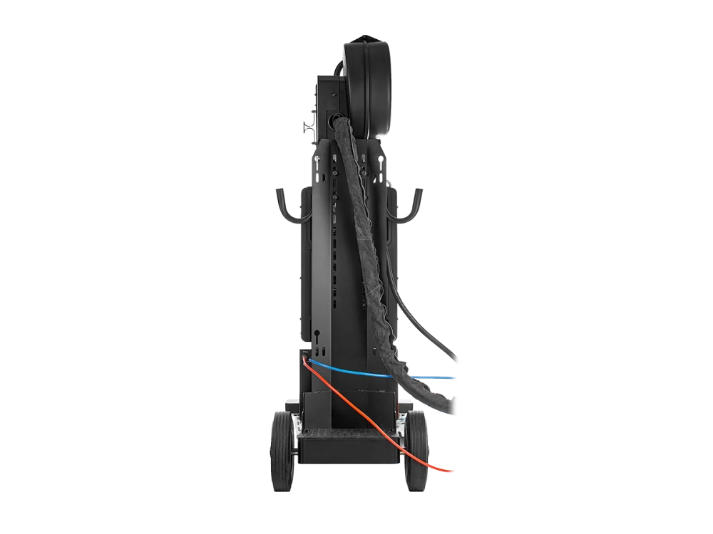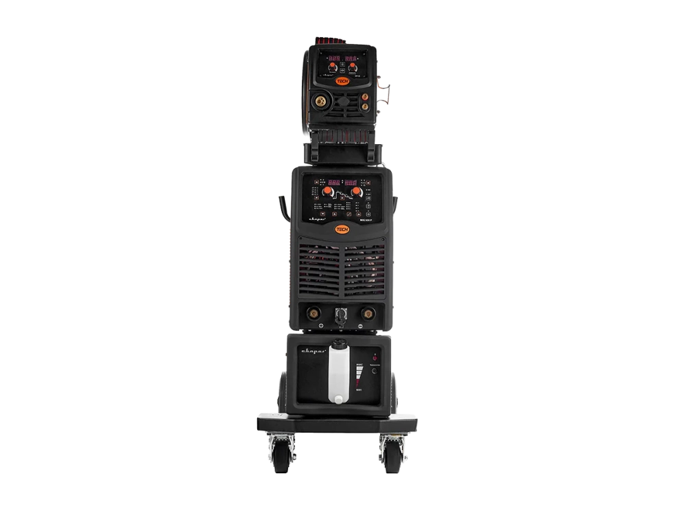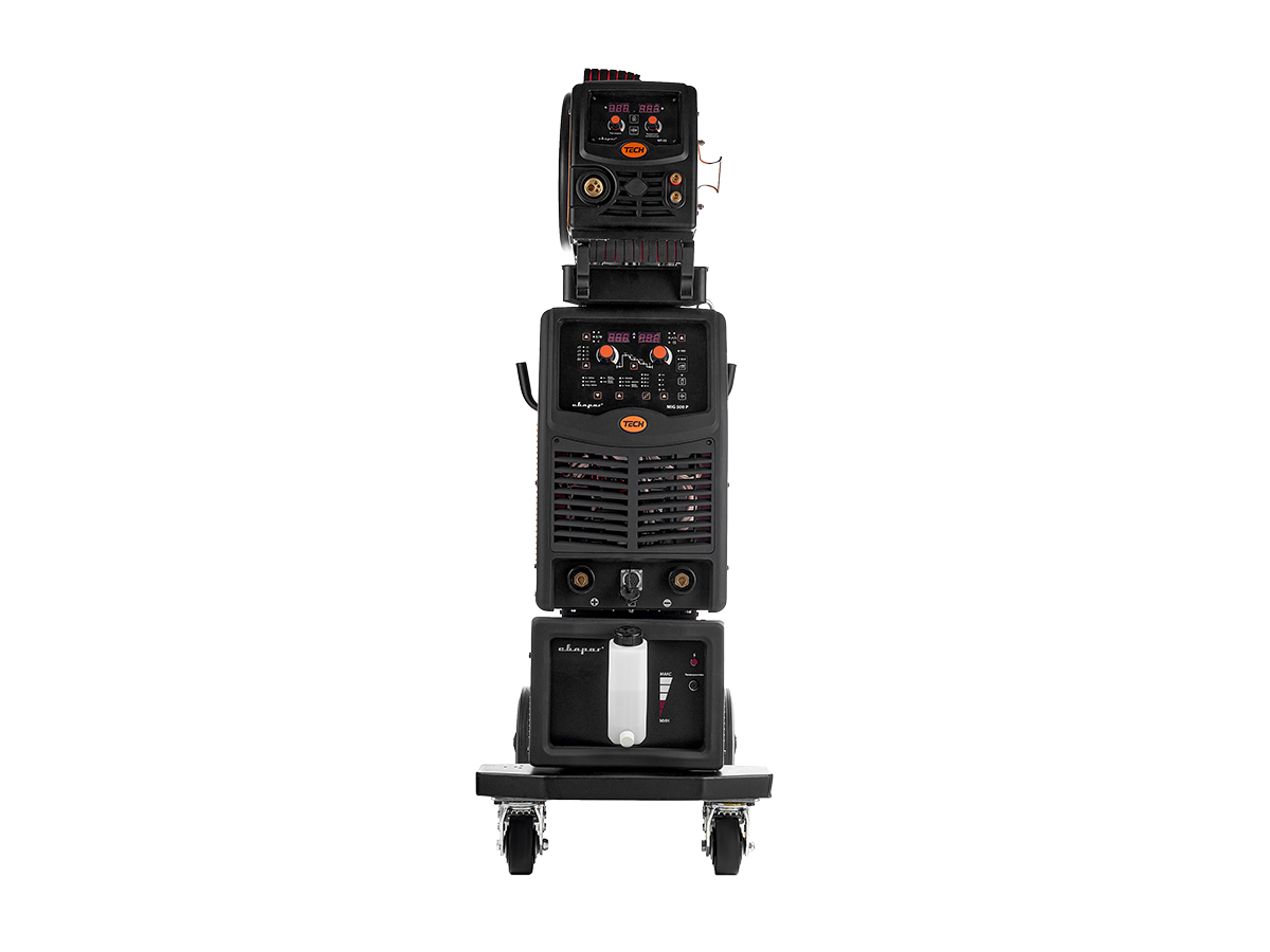 - Блочная система на прочной тележке: источник сварочного тока, подающее устройство и теплообменник