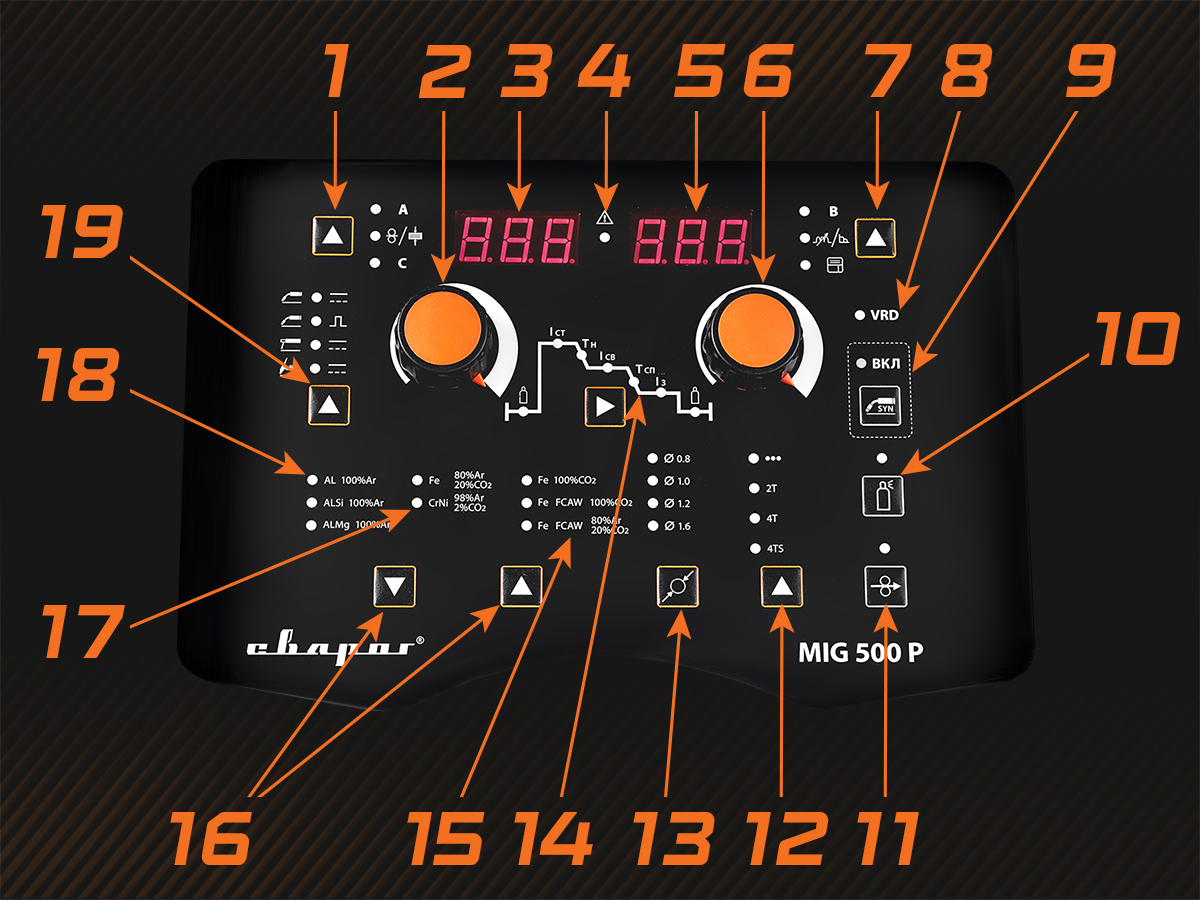 - Дисплей левый для отображения параметров сварки