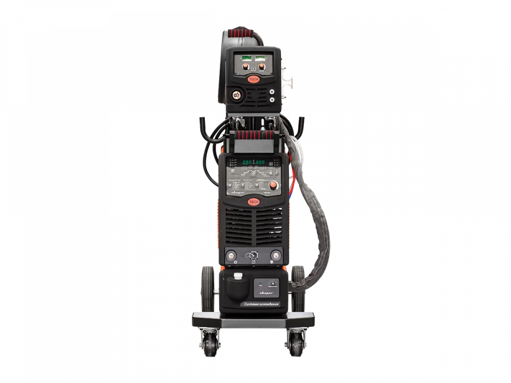 TECH MIG 350 P (N316) состоит из выносного подающего механизма, источника питания и блока жидкостного охлаждения. Все оборудование располагается на удобной тележке с площадкой для крепления баллона. Панель подающего механизма оснащена индикаторами тока и напряжения. На блоке кулера расположен индикатор уровня жидкости, а подключение блока производится без дополнительных проводов.