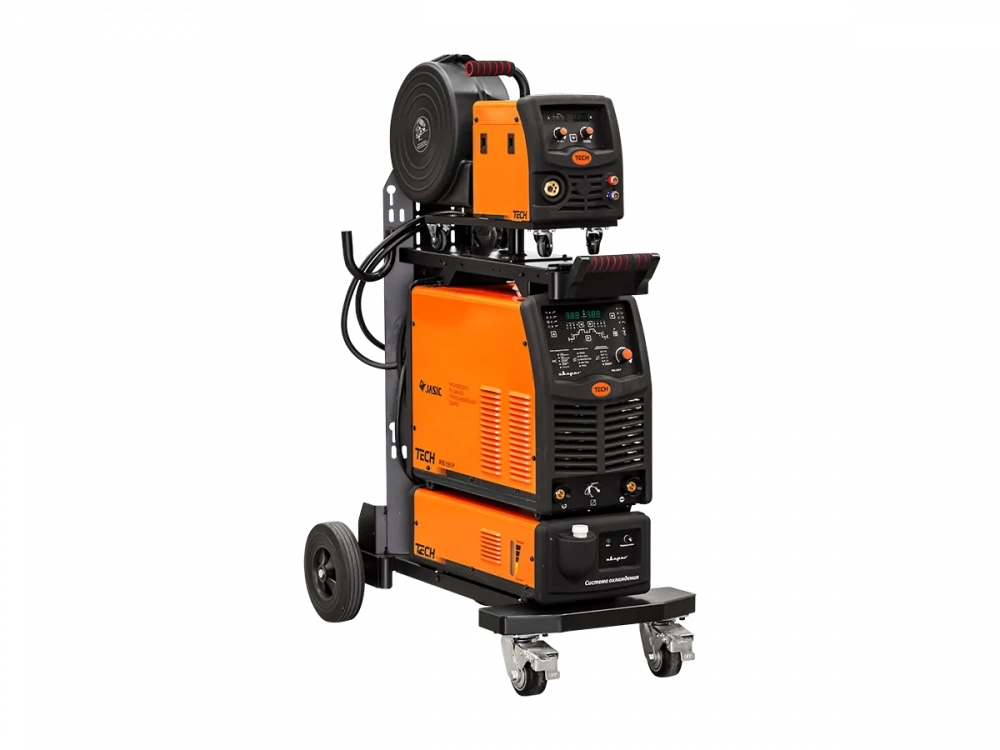 - Блочная система на прочной тележке: источник сварочного тока, подающее устройство и теплообменник